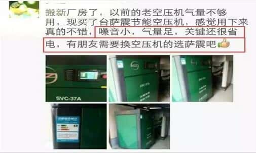該客戶用過一段時間后,是這樣說的:“搬新廠房了,以前的老空壓機氣量不夠用,現(xiàn)買了臺薩震節(jié)能空壓機,感覺用下來真的不錯,噪音小,氣量足,關(guān)鍵還很省電,有朋友需要換空壓機的選薩震吧。”