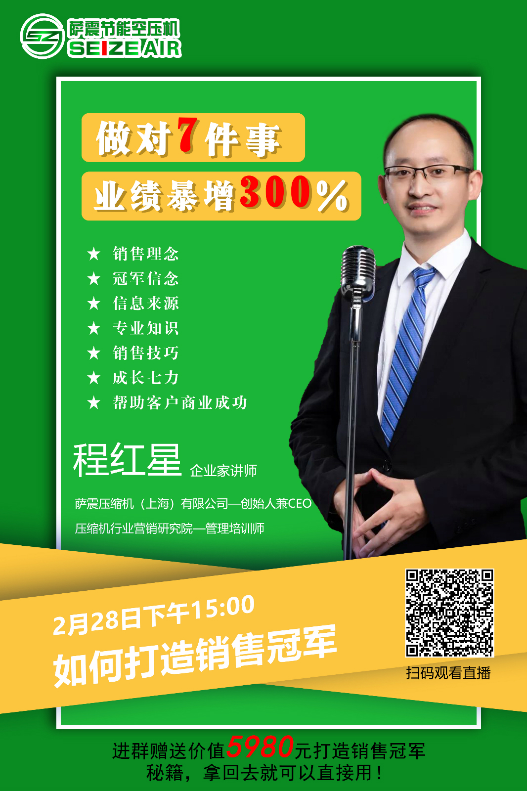 薩震節(jié)能空壓機(jī)程老師每天15點(diǎn)準(zhǔn)時(shí)開講《營(yíng)銷創(chuàng)新的7大秘訣》,