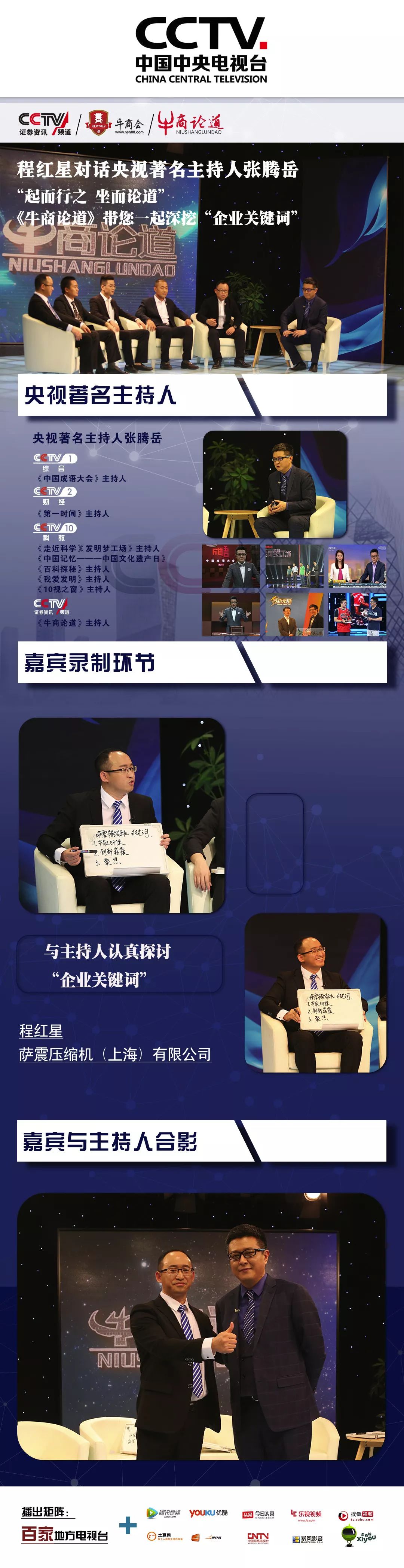 薩震壓縮機(上海)有限公司總經(jīng)理程紅星,作為第七屆上海十大牛商受邀參加央視CCTV《牛商論道》節(jié)目,與來自全國的牛商大咖,央視著名主持人張騰岳一起坐而論道。