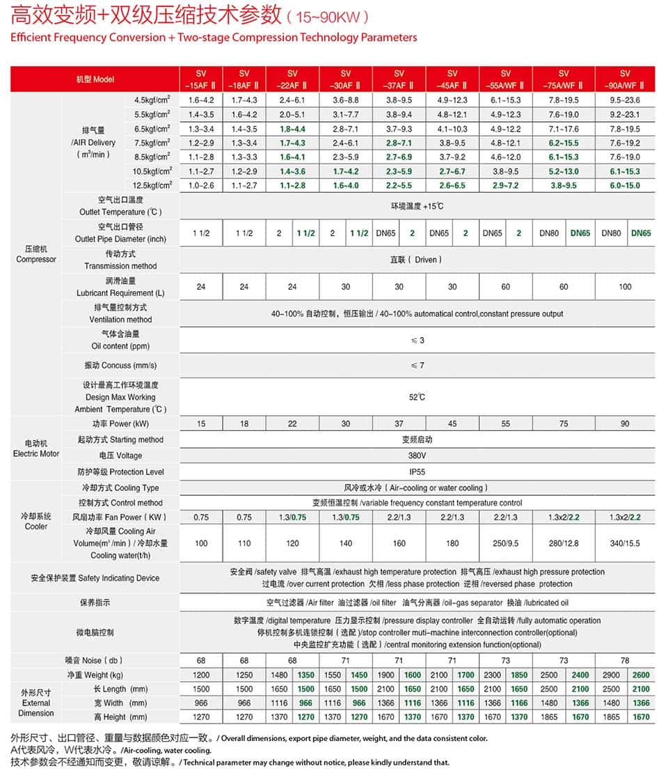 機(jī)型Machine Model | SVF-22A Ⅱ | SVF-30A Ⅱ | SVF-37A Ⅱ | SVF-45A Ⅱ | SVF-55A Ⅱ | SVF-75A Ⅱ | SVF-90A Ⅱ | |||