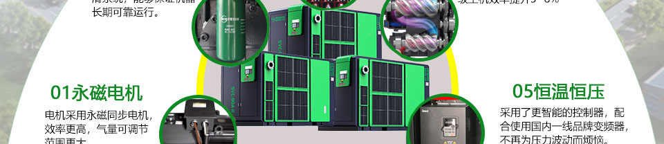 轉(zhuǎn)子:選用對(duì)稱型線,運(yùn)行效率高,選用圓柱滾動(dòng)軸承,提高了承受能力。支撐著轉(zhuǎn)子可靠的運(yùn)行,磨損小,維護(hù)保養(yǎng)費(fèi)用低,主機(jī)壽命長(zhǎng),可靠安全性高。