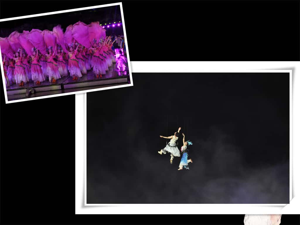 歌舞表演:快看,整齊的舞蹈隊(duì)像一朵朵盛開(kāi)海棠花,而空中的飛舞就像仙人似的,隨著風(fēng)自由的飄著,整個(gè)畫(huà)面實(shí)在是太美了。